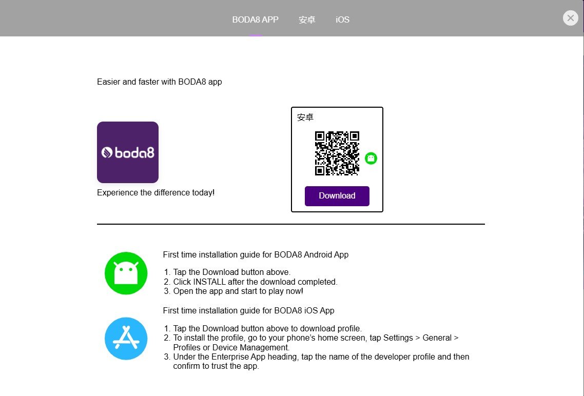 博大娛樂 BODA8HK 手機應用程式將博弈感受推向嶄新高度!無論您鍾情於熱血沸騰的老虎機、精采刺激的真人影音、體育賽事下注或休閒釣魚遊戲,此應用程式皆能提供流暢銜接的使用體驗。盡情享受頂尖的遊戲盛宴、更便利的存取服務,以及僅限應用程式使用者的專屬優惠活動。無論您身處家中或在外移動,隨時隨地都能透過博大娛樂 BODA8HK 應用程式掌握最新資訊。